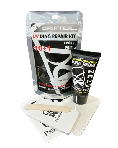 Phix Doctor’s SunPowered Universal Ding Repair Kit is stocked with endless shelf life, ultra clear, universal sunpowered resin, q-cell, dual grit sand pad, gloves and many other helpful items you won’t find in other kits.