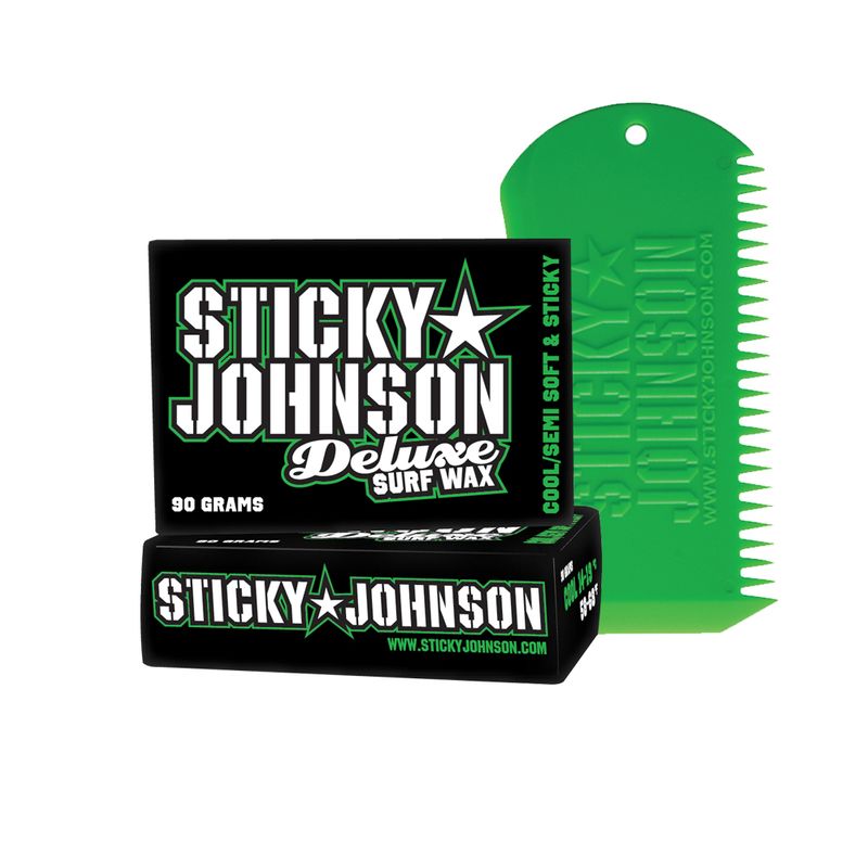 Sticky Johnson Cool Surf Wax and Comb Combo. Sticky Johnson Surf Wax is a nontoxic product which uses natural ingredients for superior traction. Our Deluxe surf wax has been scientifically engineered to provide a wax which is easy to apply, sticky, long lasting and super grippy!! Sticky Johnsons Deluxe Surf Wax is exported globally and is fastly becoming regarded as one of the best waxes in the world! Grab a block and feel the difference…
