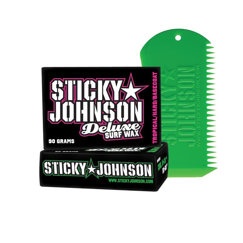 Sticky Johnson Tropical Surf Wax and Comb Combo. Sticky Johnson Surf Wax is a nontoxic product which uses natural ingredients for superior traction. Our Deluxe surf wax has been scientifically engineered to provide a wax which is easy to apply, sticky, long lasting and super grippy!! Sticky Johnsons Deluxe Surf Wax is exported globally and is fastly becoming regarded as one of the best waxes in the world! Grab a block and feel the difference…